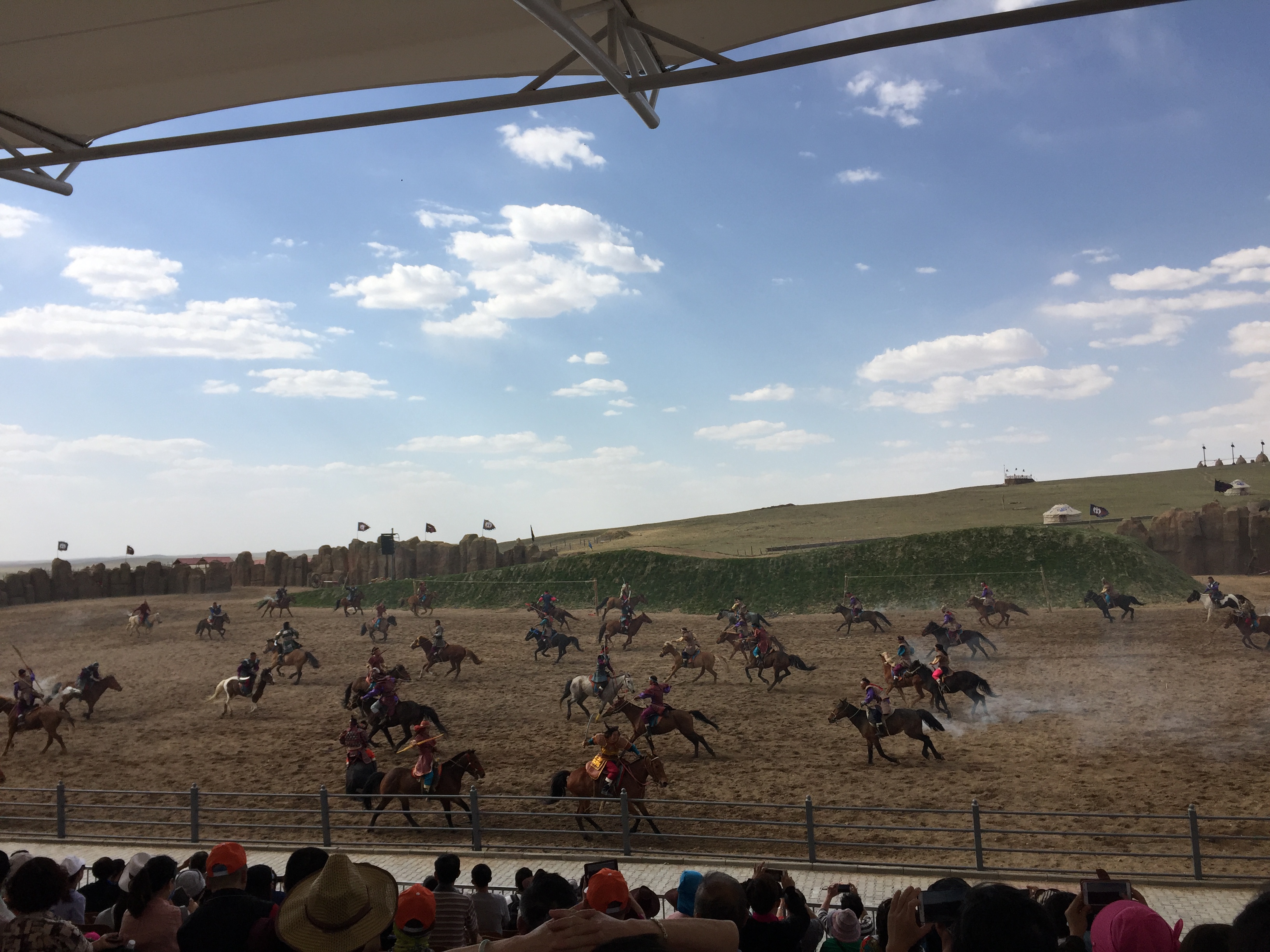 第二天一早就隨旅游車跨陰山進(jìn)草原,車上伴著陳導(dǎo)的講解,才發(fā)現(xiàn)這陰山正是那“不教胡馬度陰山”的陰山山脈,實(shí)在是連綿不斷,相比起來廣東那些還真只能稱為山丘;汽車行駛蜿蜒盤旋看不到盡頭的公路上,不由感嘆現(xiàn)代的工程技術(shù)同時(shí)更佩服古代那胡馬??邕^陰山山脈的大青山之后,不久就到了希拉穆仁大草原的一個(gè)馬場,下車就接受蒙古族的迎賓禮儀下馬酒,敬天敬地敬先祖,此乃成吉思汗急智的試毒三敬。接下來就是我們南方人最為期待的騎馬馳騁草原了,以往在電視上見多了別人騎馬,真到自己能上去騎還是非常激動的,實(shí)在是壓抑不住想揚(yáng)起馬鞭縱情狂奔在一望無際的大草原之上,但是畢竟我們沒有經(jīng)受過真正的訓(xùn)練,出于安全考慮只能放慢腳步來領(lǐng)略這異地風(fēng)光,一路上各種歡聲笑語,時(shí)不時(shí)夾雜著女同事的尖叫聲,大家都放下了心理的包袱享受著著前所未有的平靜;看著遠(yuǎn)處稀稀疏疏的蒙古,也是應(yīng)了陳導(dǎo)那句“稀稀拉拉木有人大草原”,突然心中向往以后自己要是能在草原生活一段時(shí)間多好。自己騎過馬之后發(fā)現(xiàn)了騎馬的不簡單,下午就要看馬背上的民族“蒙古族”表演真正的馬術(shù)了;看完表演才明白當(dāng)年的蒙古騎兵,能夠縱橫四海開拓蒙古帝國那無邊的版圖并不是偶然的,有一代天驕成吉思汗的帶領(lǐng)加上排山倒海的蒙古騎兵四海之內(nèi)能有何敵手。身處紅格爾敖包,不知何時(shí)自己已經(jīng)深深的折服在成吉思汗亦或是那個(gè)時(shí)代蒙古族一往無前的精神當(dāng)中;的確,一個(gè)名族的精神能夠共鳴如斯,哪有不屹立于世界之巔的理由,一個(gè)現(xiàn)代團(tuán)體如果能有精神何愁大事不成呢。